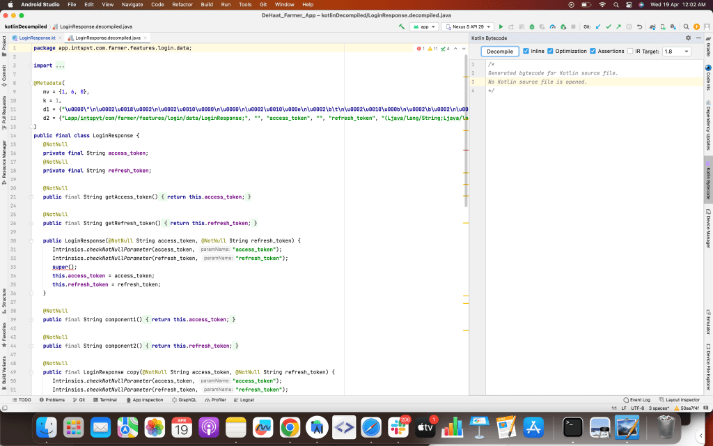 In the bytecode tool window, click the “Decompile” button at the top left. A new tab will open showing FileName.decompiled.java, a Java version of the bytecode the Kotlin compiler generated for the JVM. The bytecode gives a behind-the-scenes look at Kotlin’s type inference support.