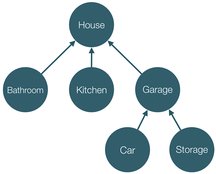 As per this tree, House has 3 dependencies, namely Bathroom, Kitchen and Garage and similarly Garage has 2 dependencies, namely Car and Storage.