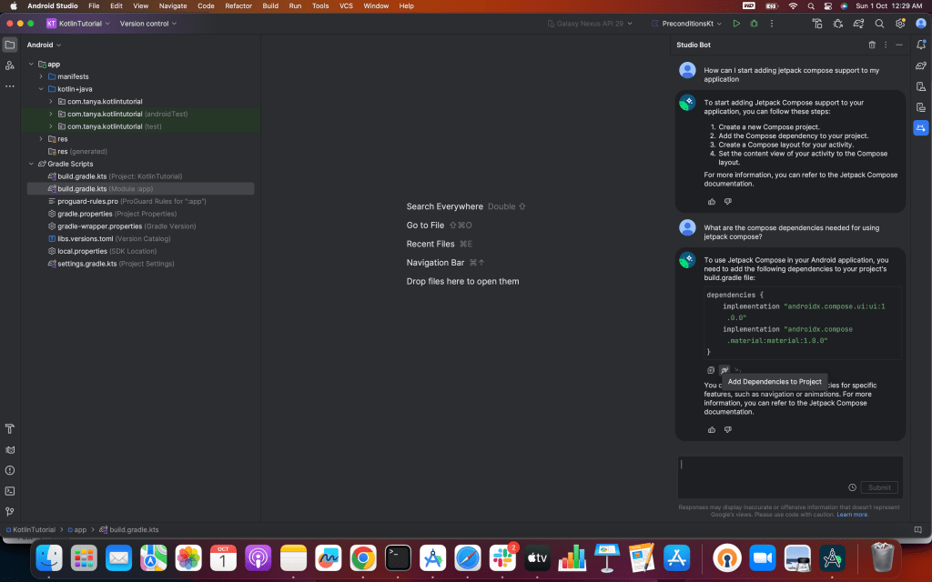 2. Add generated code with a click: Studio Bot displays smart actions next to the code it generates, which lets you quickly insert the code into the open editor, insert it into the Android Manifest, or even add required dependencies for popular libraries that are used in the answer.