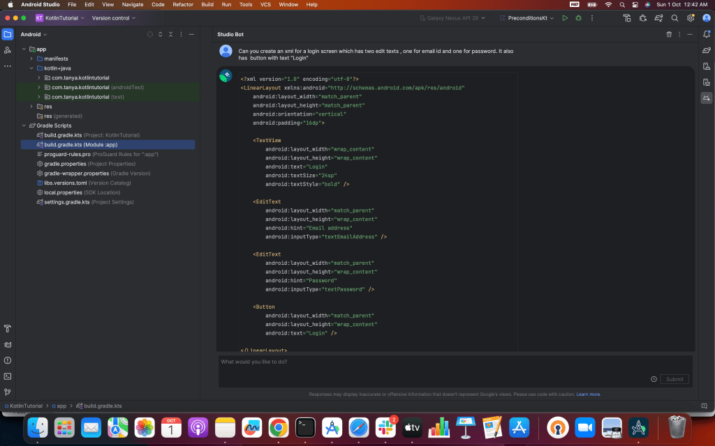 1. Generate Code: You can ask Studio Bot to generate pieces of code for you. Need to create a xml layout for a login screen, just ask !!